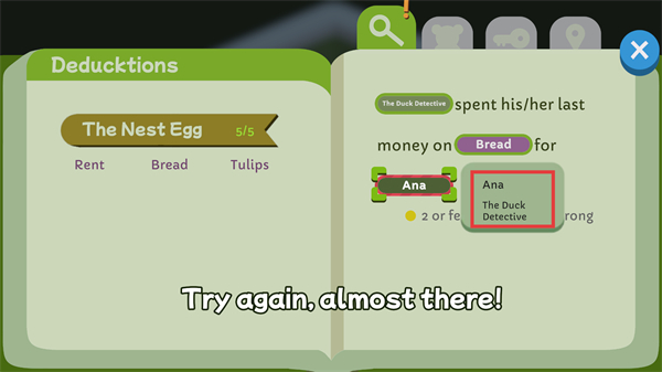 3、在推理环节,根据收集的线索进行推理,若推理错误会有提示,需调整思路重新推理。