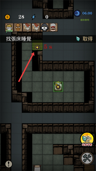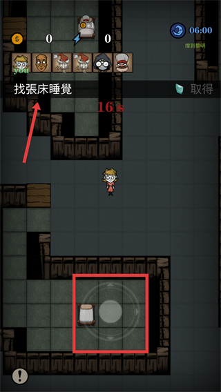 2、游戏中按照【找張床睡覺】的提示,移动角色到红色框内的床位置,完成睡觉任务。