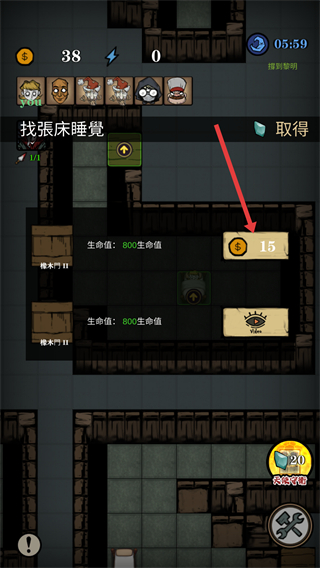 3、进行睡觉时将会获得金币,拥有足够的金币时,点击【门】进入升级界面。