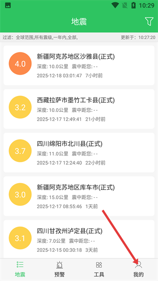 1、打开软件进入震况,可以查看全球范围内的所有震级。