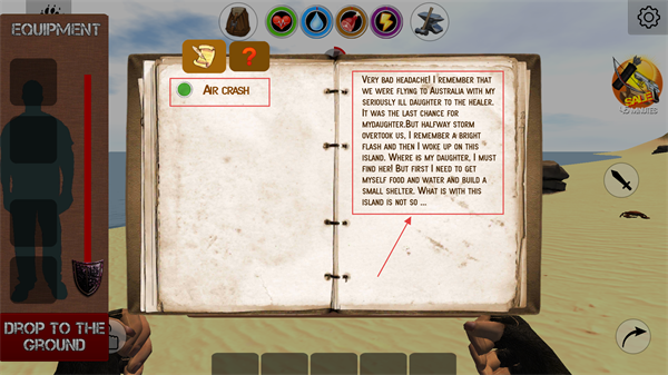 2、查看【AIRCRASH】日记内容,明确首要任务是找食物水源,还要搭建小型庇护所保障生存安全。