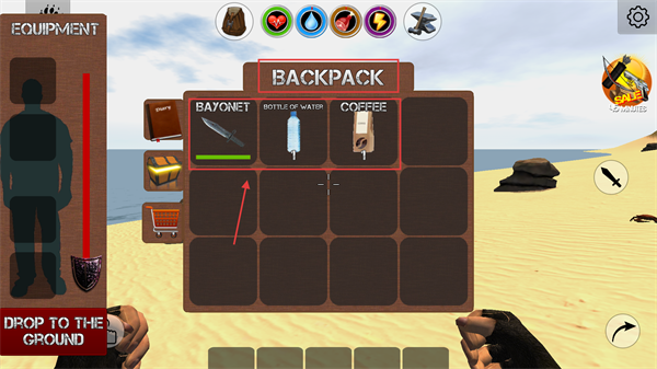 3、利用背包内的【BAYONET】-【BOTTLEOFWATER】-【COFFEE】,满足武器、水分及能量补给需求。