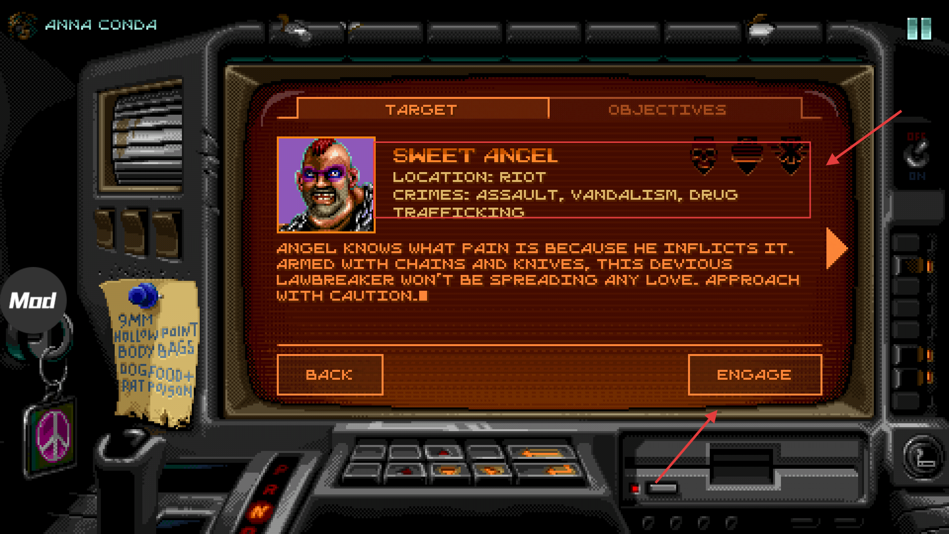 3、查看目标界面中【SWEETANGEL】的罪行与位置,点击【ENGAGE】按钮展开追捕行动。