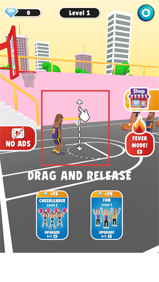 1、在Level1界面,按提示【拖拽并释放】角色,调整拖拽方向控制角色移动,目标是完成投篮或得分任务。