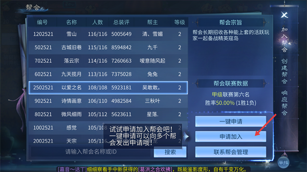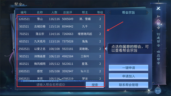 2、在帮会列表中,可查看帮会的人数、总装评、帮主、等级等信息。