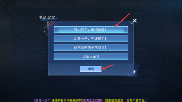 4、在申请留言界面,选择留言,点击【申请】,提交帮会加入申请会。