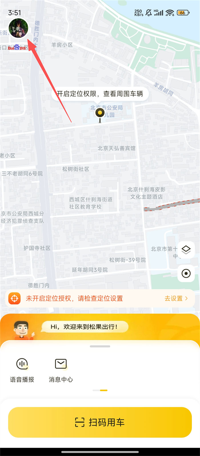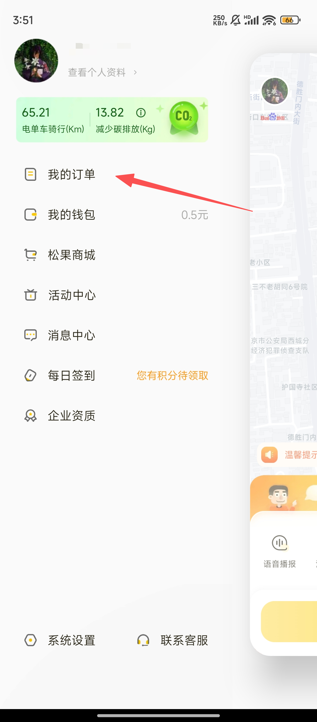 1、打开【松果出行】App,点击左上角头像,展开个人功能栏。