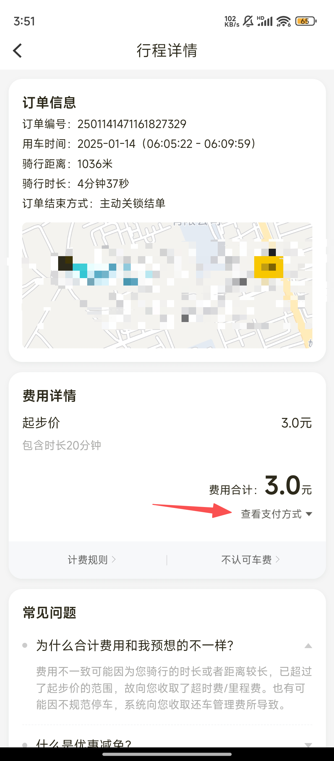 4、在行程详情页,可查看订单的骑行距离、时长、费用等记录信息,还可点击展开支付方式呢。