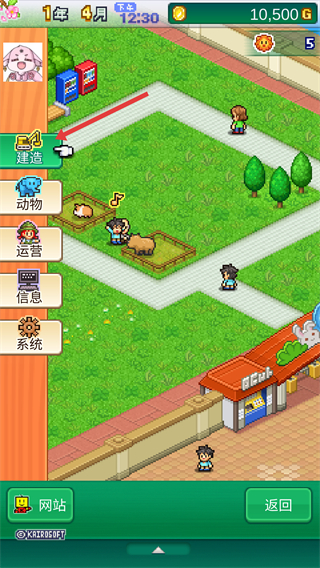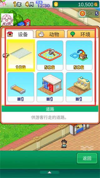 4、在建造界面的红色框内,可选择建造道路、设施、动物栖息地等,规划动物园布局,吸引游客并提升动物园等级。