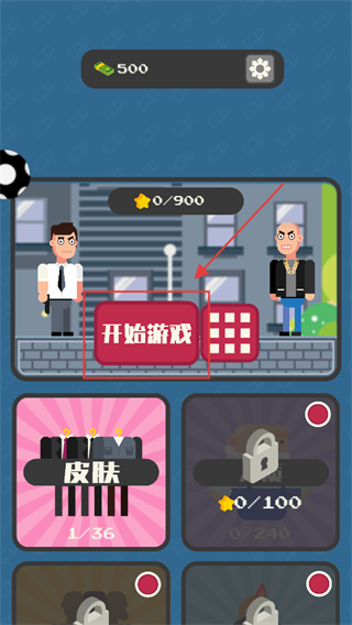 1、点击【开始游戏】按钮进入关卡,界面包含【皮肤】模块与锁着的功能区域,积累星星解锁更多游戏内容。