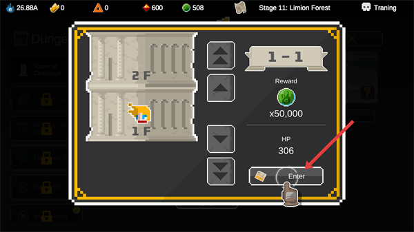 1、点击【Enter】按钮,进入【Stage-11:Limion-Forest】的【1-1】关卡挑战。