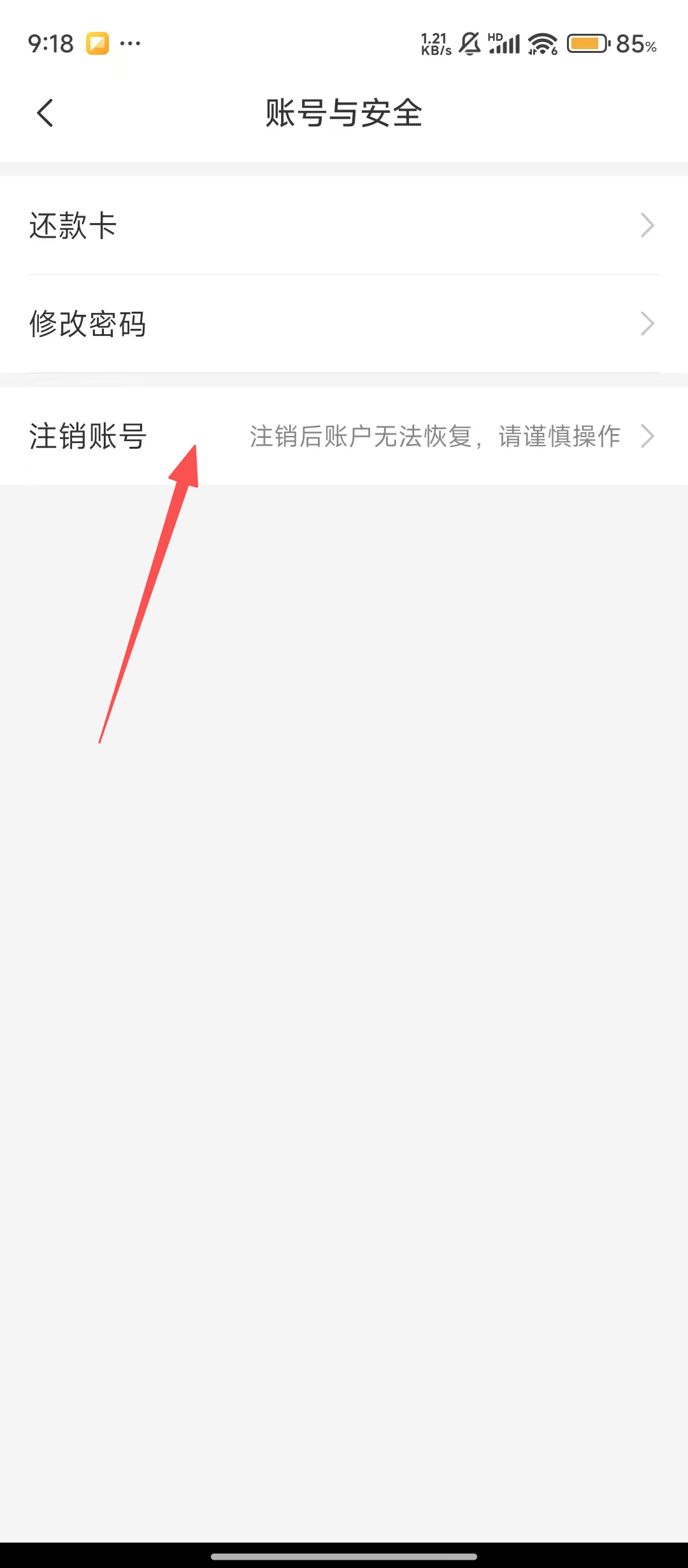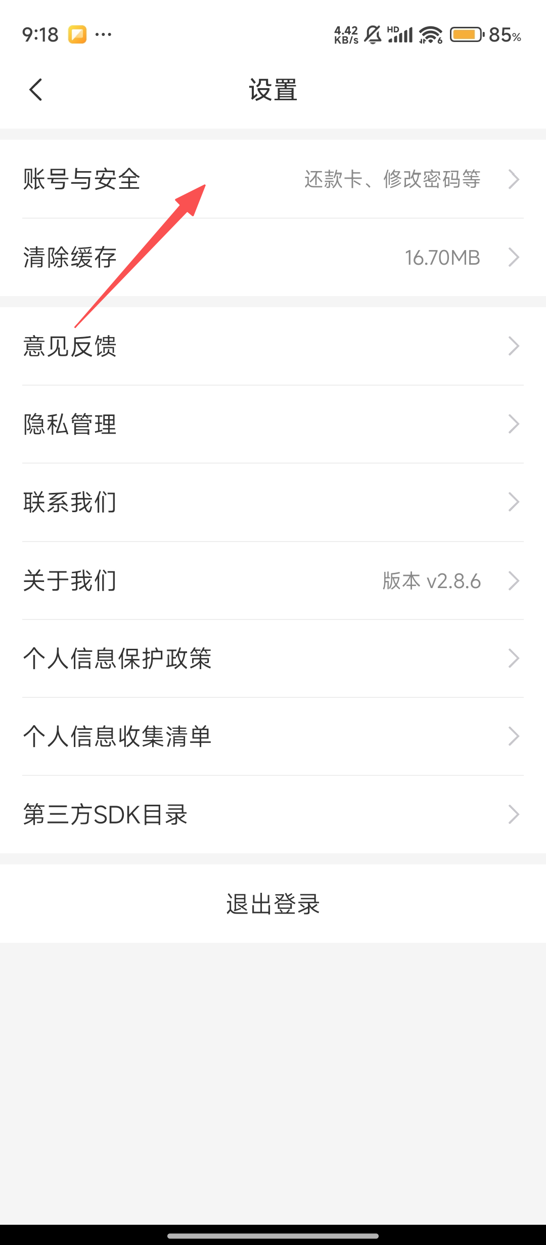 3、进入设置后,找到并点击【账号与安全】选项,这里可以管理还款卡、密码等安全相关事项呢。