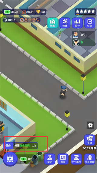 1、游戏中需完成各类任务(如修建黄金房间),推进任务进度(如1/2),获取任务奖励和提升校园运营水平。