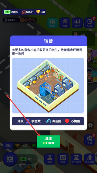 2、建造校园设施如宿舍,如图箭头提示点击按钮进行建造。