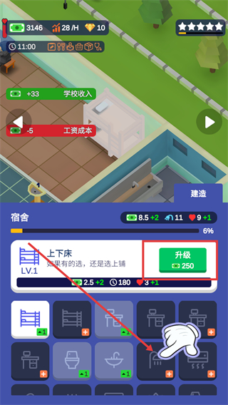 4、升级宿舍内的设施(如上下床升级,耗费250金币),提升宿舍的容纳能力和居住条件,进一步吸引学生入学。