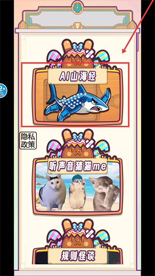 1、选择【AI山海经】模块进入核心玩法,这里可体验钓鱼刮鳞等操作,是处理怪异鱼类的主要入口。