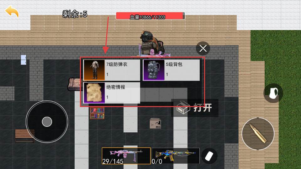 2、打开物资箱获取【7级防弹衣】-【5级背包】-【绝密情报】,提升生存能力与情报储备,为后续战斗做准备。