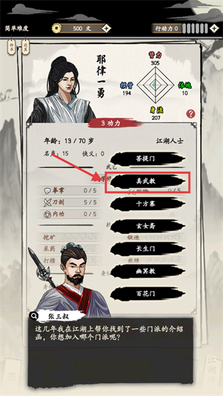 2、门派选择选【真武教】加入,学习门派武学,提升武艺,助力江湖闯荡。