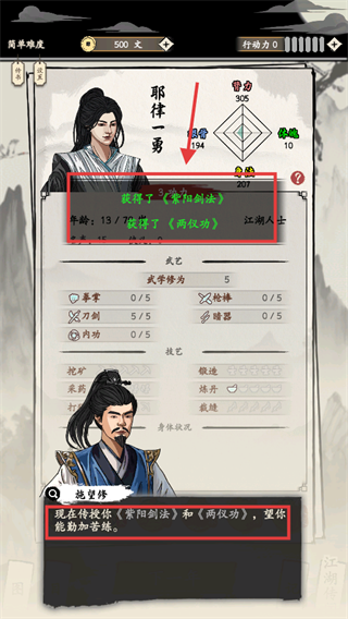 3、加入门派后获【紫阳剑法】【两仪功】,需勤加练习,提升自身实力。