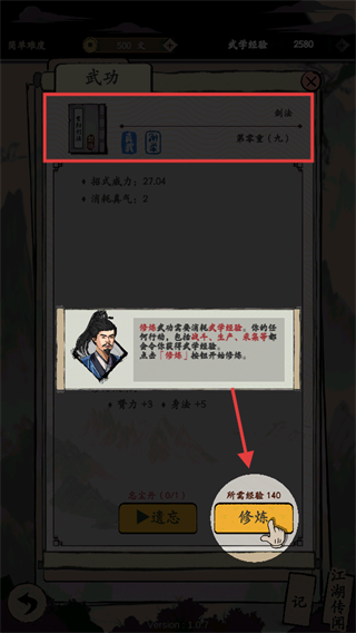 4、进入武功界面选【紫阳剑法】,点击【修炼】,消耗经验提升功力属性。