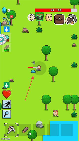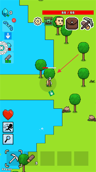 1、在像素世界草地场景中,控制角色使用【斧头】砍伐【树木】,获取【木材】资源以推进后续建造任务。