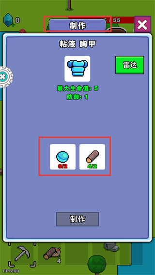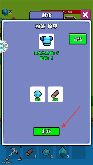 4、当【粘液】-【木棍】材料均达标时,点击【绿色制作按钮】完成【粘液胸甲】制作增强防御。