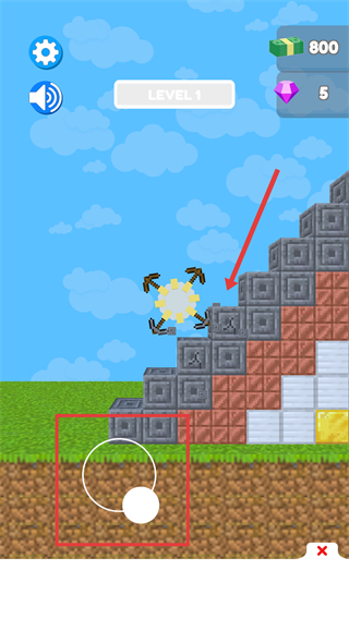 2、操控红色框内的白色圆圈,瞄准灰色方块区域,发射挖矿工具进行挖掘。