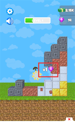 3、持续挖掘,收集红色框内的钻石(如【+1】钻石),积累资源提升进度。