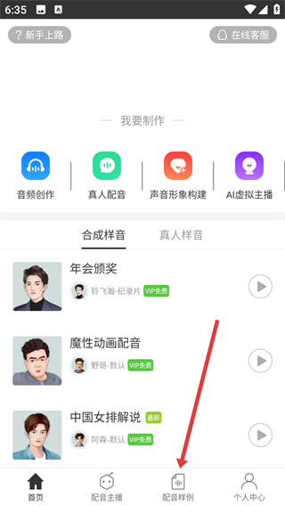 1、我们打开讯飞配音App,点击底部【配音样例】,进入合成配音样例页面哦。
