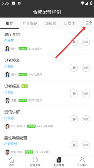 2、在合成配音样例页面,点击右上角【三个横线】图标,即可寻找心仪配音类型呢。
