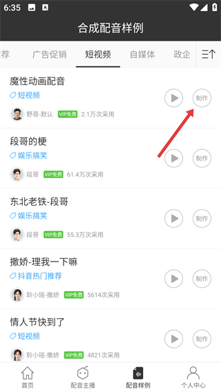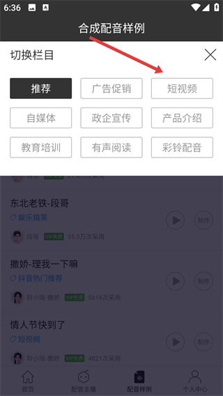 3、在切换栏目中选择【短视频】,就可以查看该类别的配音样例,便于挑选合适风格哟。