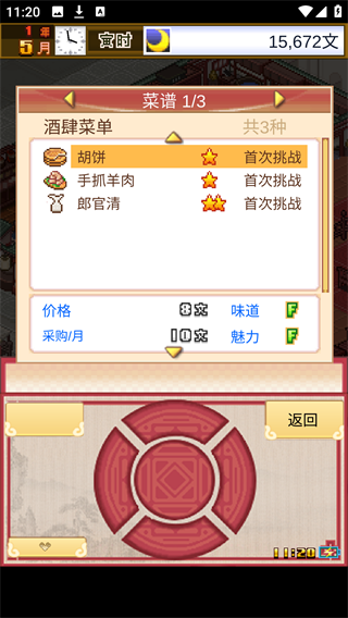 3、菜谱界面中优先挑战高星级菜品如郎官清,成功开发后可提升菜品价格与魅力,吸引更多食客。