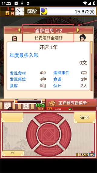 4、查看酒肆信息时,需关注年度入账、食材及伙计数量,适时补充食材或招募员工以优化经营效率。