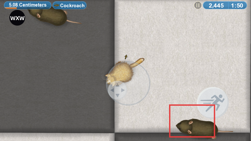 1、控制角色移动,捕捉老鼠,积累分数,提升自身等级。
