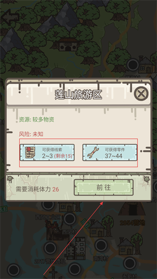 2、在地图界面,选择“莲山旅游区”等资源点,点击【前往】,消耗体力26。