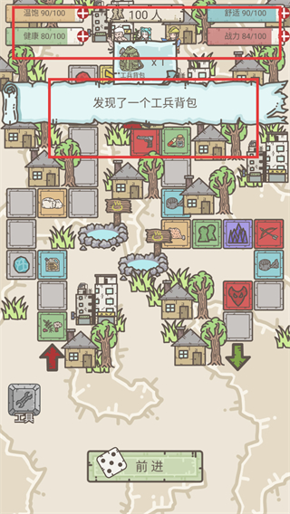3、在探索过程中,留意资源获取提示(如“发现了一个工兵背包”),同时关注人口等属性,确保生存和发展的平衡。