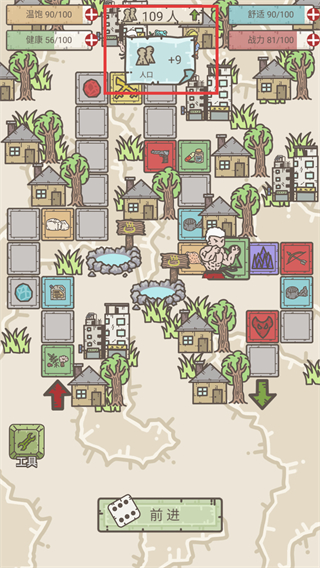4、通过探索和资源积累,提升人口数量(如从100人增加到109人),优化健康等属性,解锁更多生存区域和资源点。