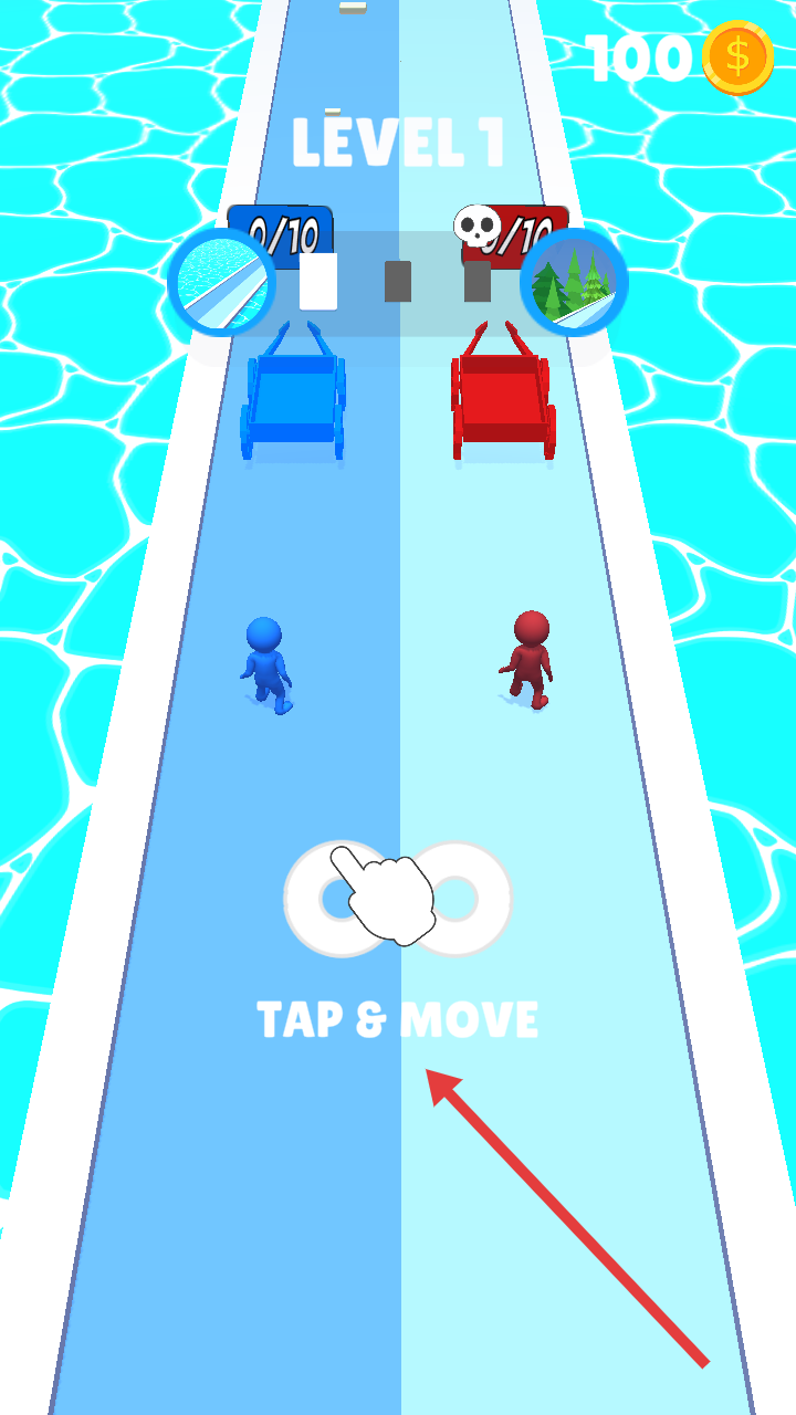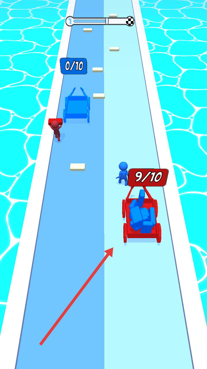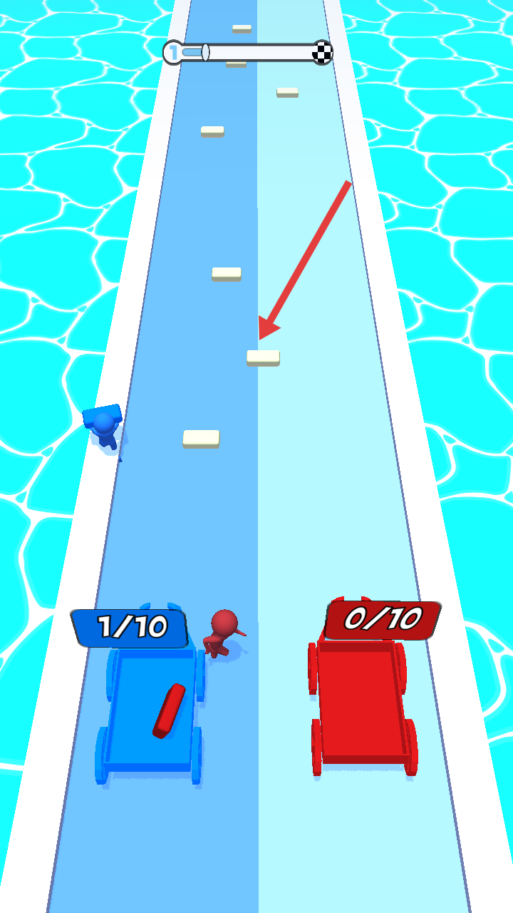 1、点击并移动屏幕,在水上赛道操控小人收集方块,向关卡目标推进,开启方块收集竞争挑战。