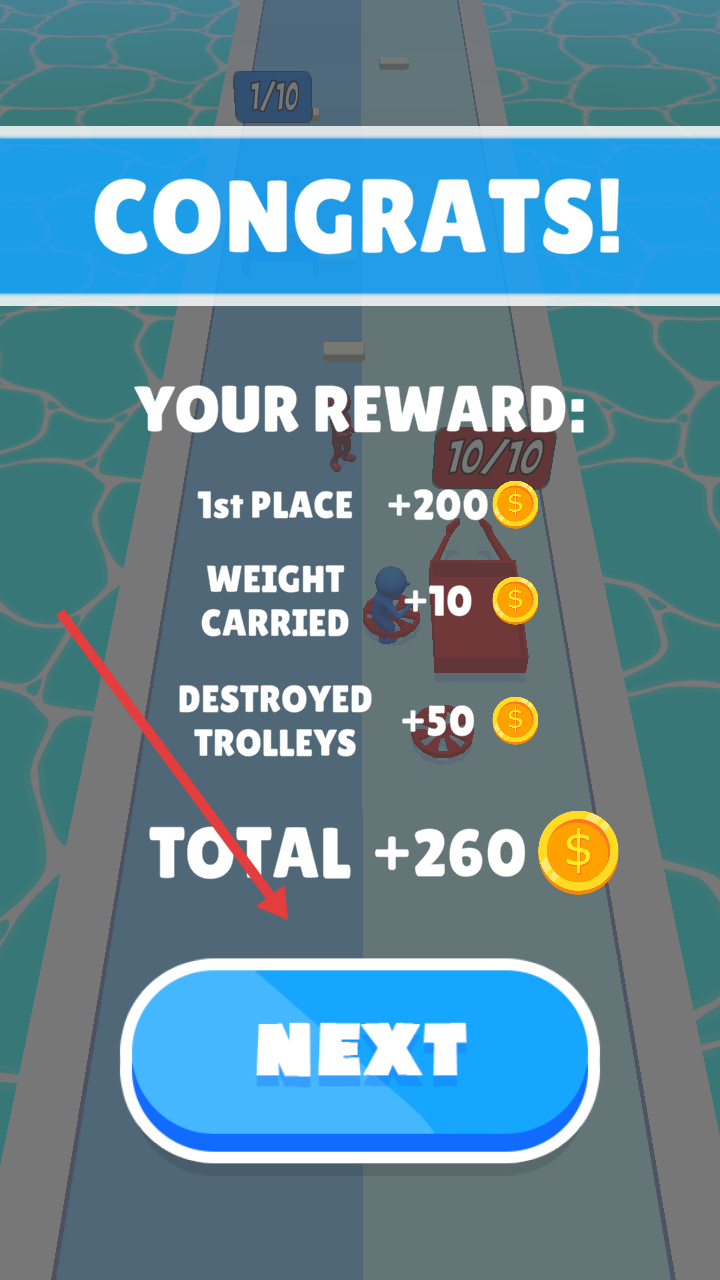 4、关卡胜利后点击NEXT按钮进入下一关,继续挑战更多水上赛道的方块收集竞争关卡。