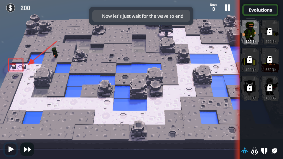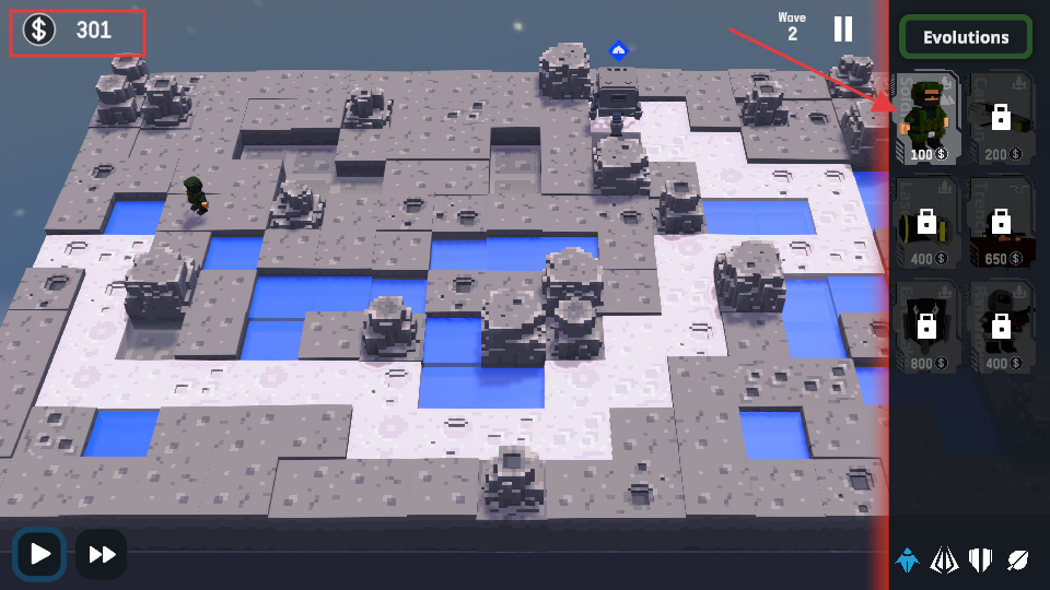 2、利用金钱(如301美元)在右侧“Evolutions”栏购买防御单位,如士兵,部署在地图上抵御敌人。
