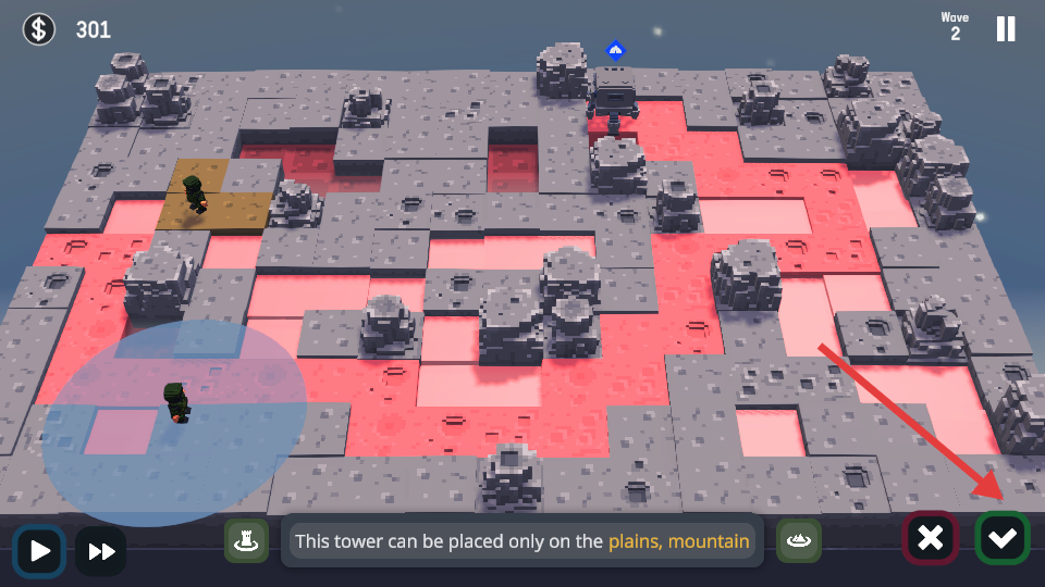 3、选择合适的地形(平原、山地)放置防御单位,点击绿色对勾确认部署,提升防御效果。