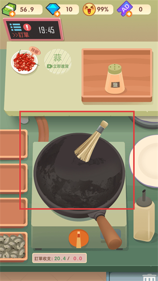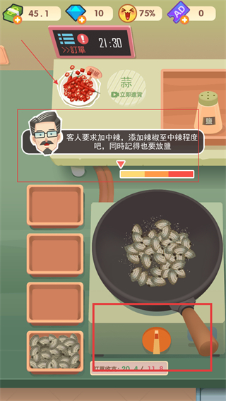 4、根据订单加入适量辣椒和盐,并且根据提示打开火进行翻炒。