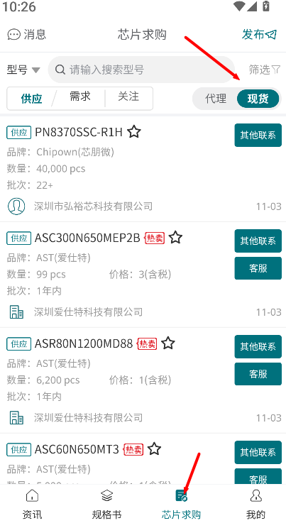 3、打开“芯片求购”板块,可查看现货与热卖芯片信息,并可直接联系供应商进行采购。