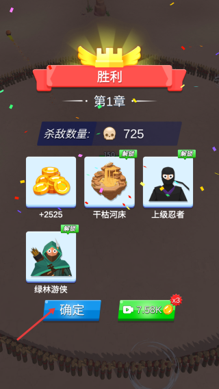 4、战斗胜利后点击【确定】,领取金币和解锁奖励,继续挑战后续章节,提升游戏进程。