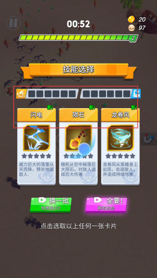 1、选择闪电、陨石、龙卷风等技能,提升战斗能力,为消灭敌人和推进关卡做准备。