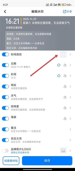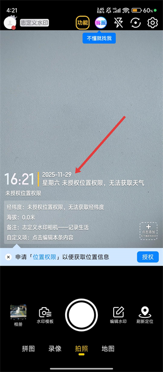 选择照片记录生活时,可以添加时间,位置,经纬度,数字和其他样式。