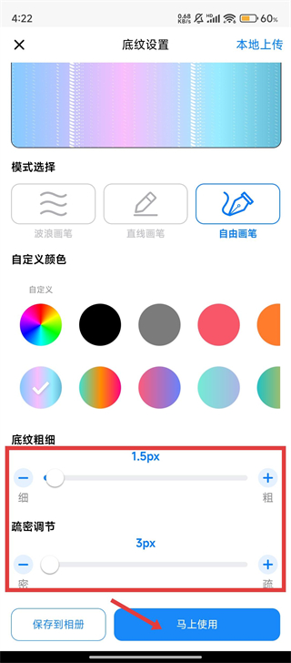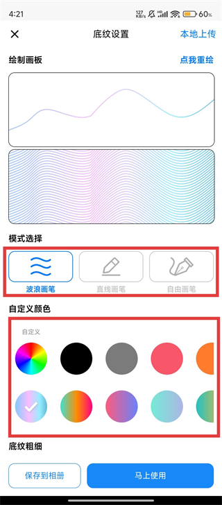 3、在底纹设置页,选画笔样式并挑自定义颜色调整水印外观啦。