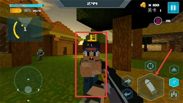 3、遇到红色框内的敌人时,可点击红色箭头指向的火箭弹按钮,使用火箭弹对其发起强力攻击。