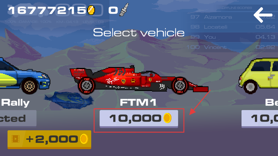 1、在【Selectvehicle】界面,攒够【10,000】金币即可解锁FTM1赛车进行挑战。