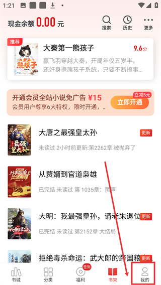1、进入书架页面,点击底部【我的】选项,可进入个人中心页面。